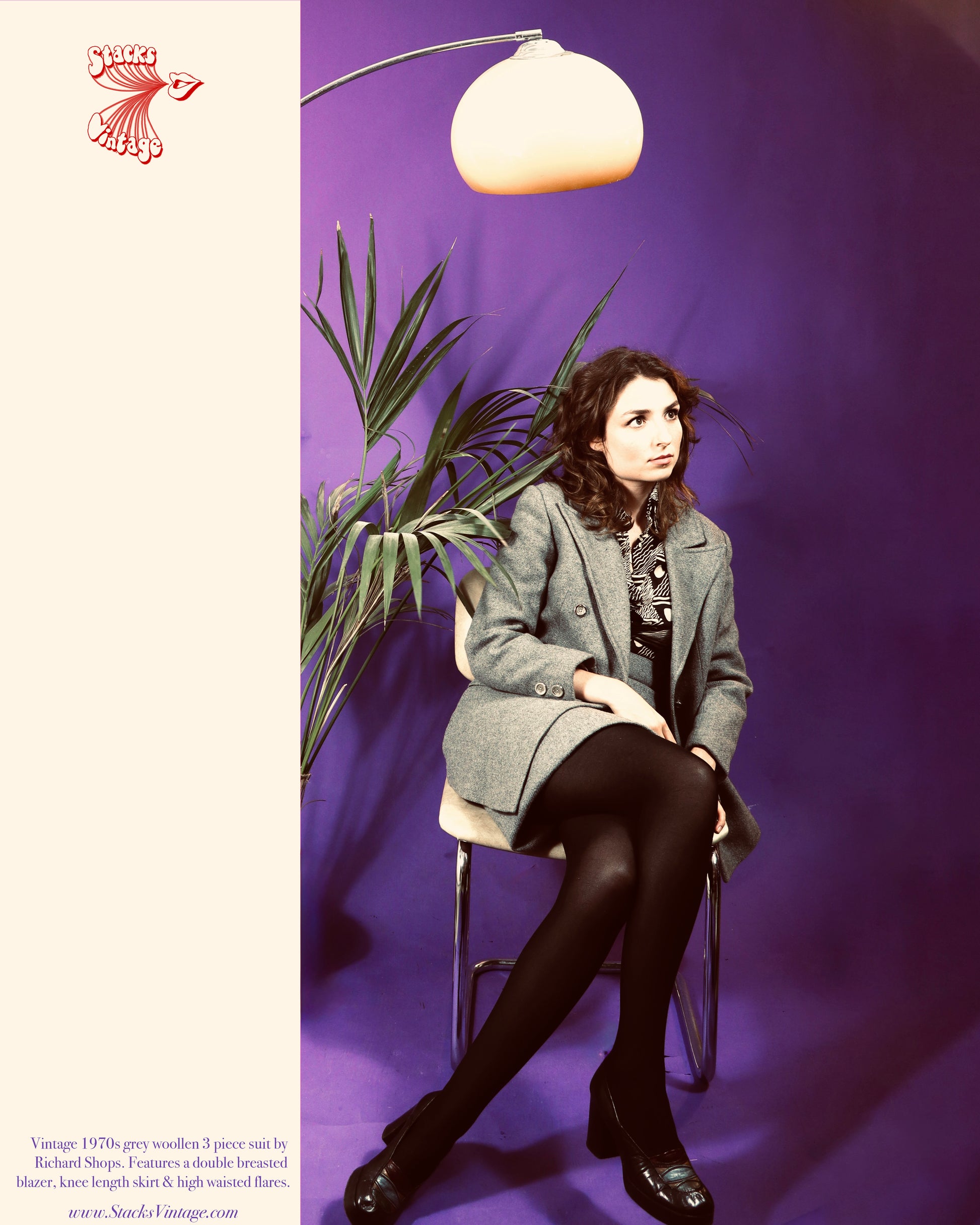 Fantastic vintage 1970s 3 Piece suit by label Richard Shops. Soft grey wool cut with a double breasted blazer, high waisted flares and a knee length skirt. Super versatile, chic, timeless tailoring in a classic colourway. So many high quality details! I love the masculine, boxy cut. Lining for comfort in all pieces.