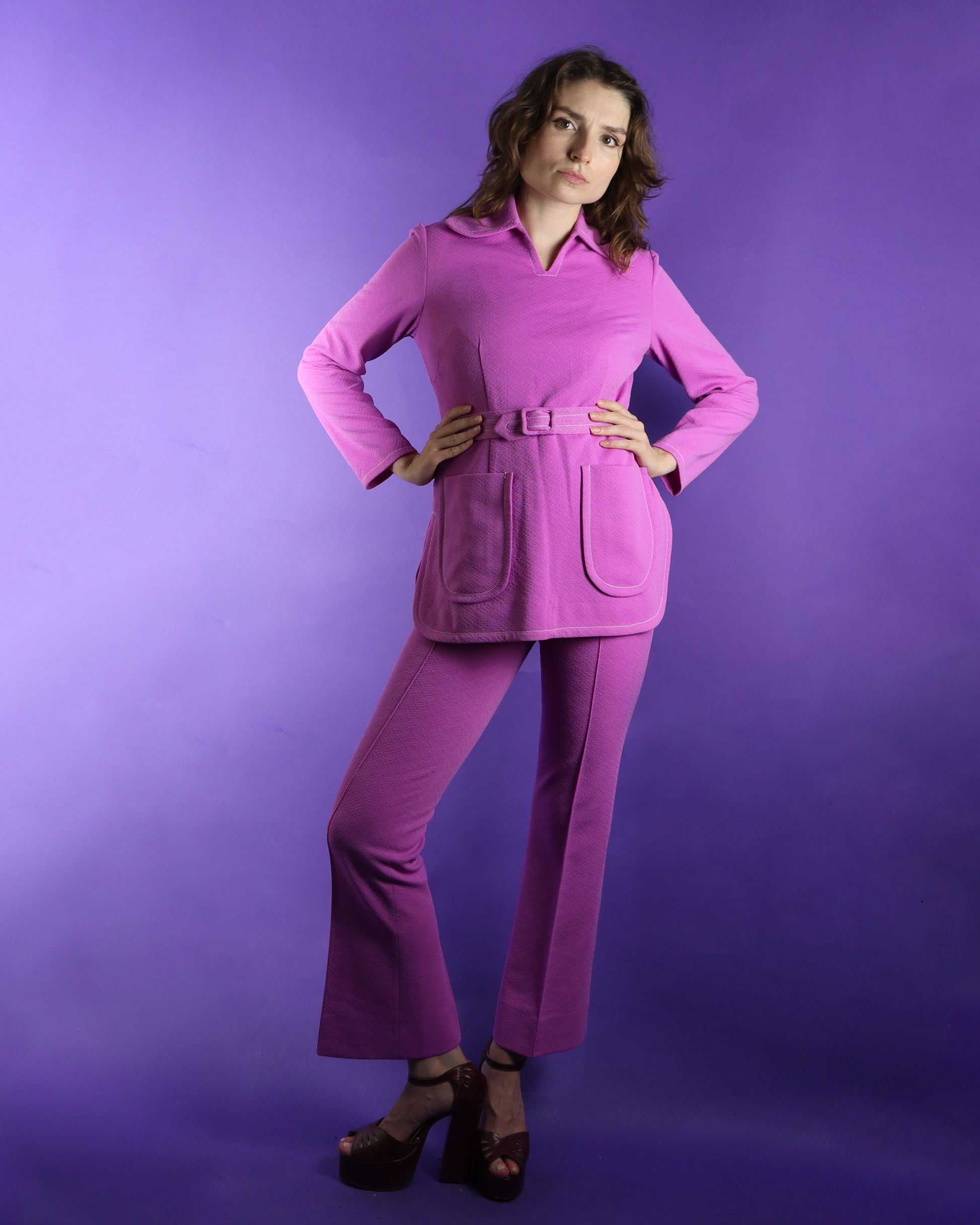 Rare vintage 1970s rodeo western trouser suit, from a real cowgirl's collection. Tailored by 'Lasso Westernwear'. Featuring western style panelling, a kick flare and belted smock top with rounded collar. Made from a figure hugging, ultra flattering texturised stretch material in striking hot pink colourway.
