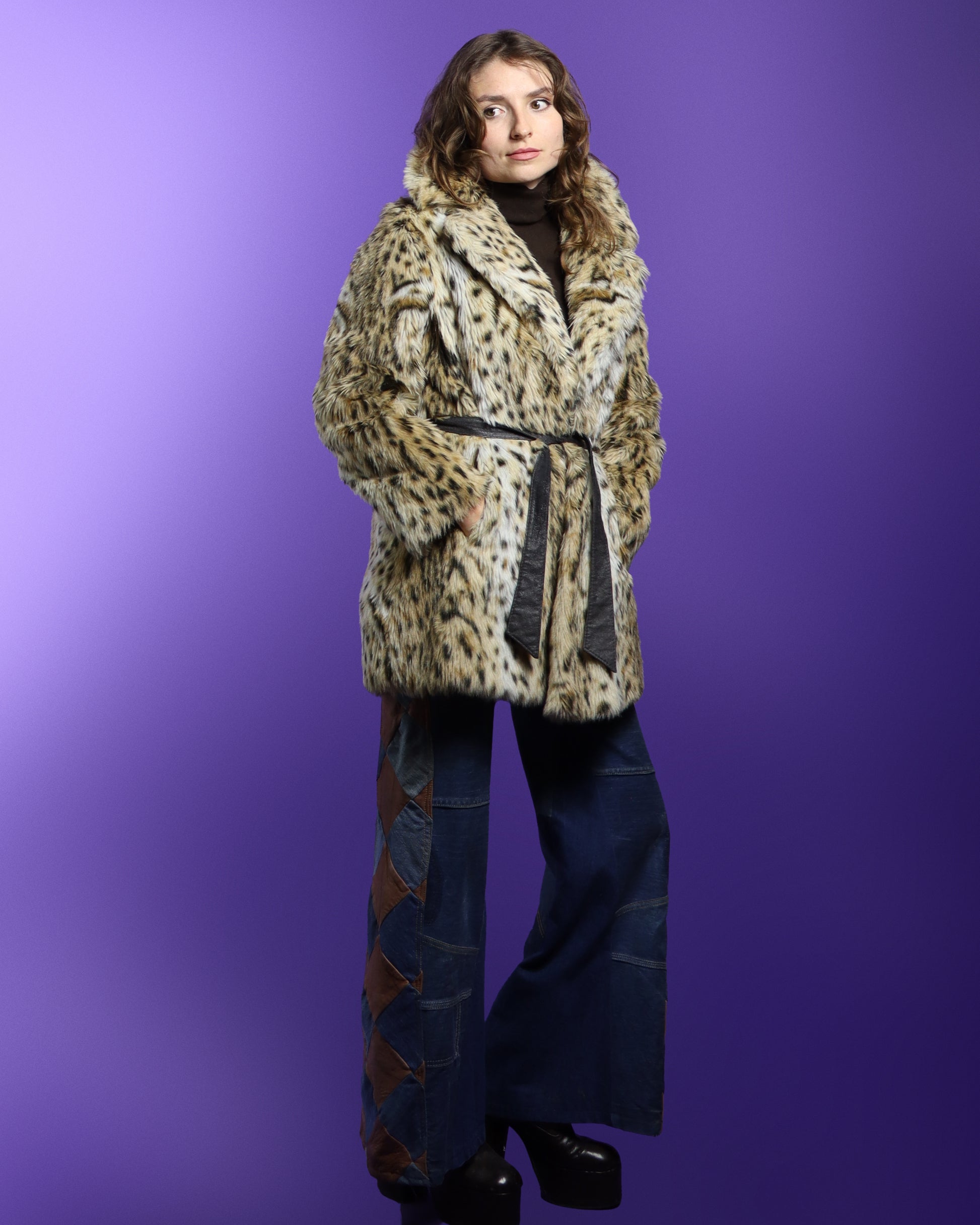 Vintage 1970s leopard print faux fur coat. Super chic and realistic patternation on a soft faux fur. Fastens using hidden hooks and a tie belt. I love the large round lapel collar, the hidden side pockets and the flattering hip length. Fully lined and beautifully made. A winter wardrobe staple!