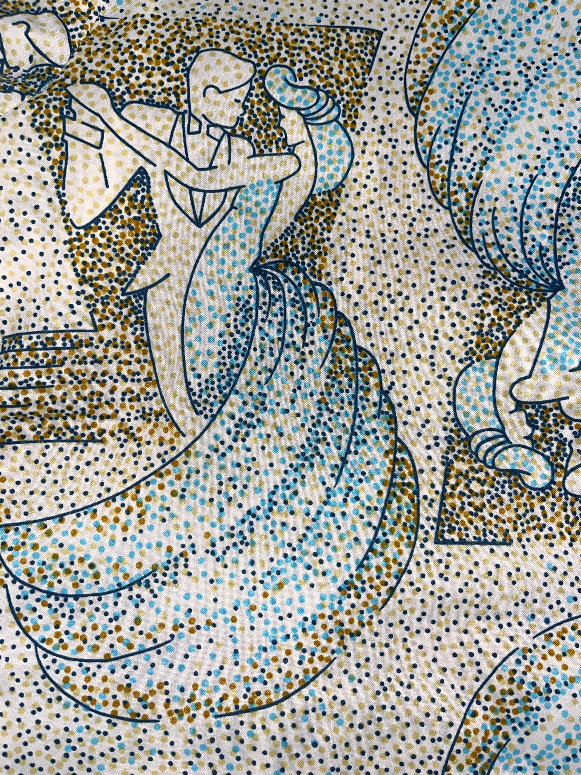 Vintage 1970s dagger collar shirt by collectible brand 'Brutus'. Ballroom dancers in pointillism style graphic printed onto soft cotton in blues, browns and white. Cut with a super dramatic elongated dagger collar and finished with large acrylic white buttons. A beautifully made piece which is perfect under a 70s suit!