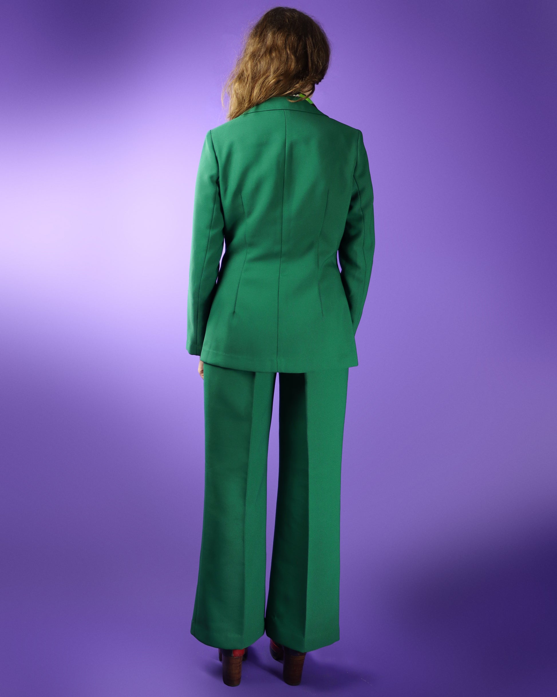 Fantastic vintage 1970s trouser suit by Spinney. Bottle green coloured lightweight fabric. The blazer features a wide shield lapel, sharp shoulder pads, large patch pockets and a classic 70s form fit. The trousers are high waisted wide leg flares with sharp pleating front and back. A fabulous silhouette in a classic and cool colourway, beautifully finished. In impeccable condition.