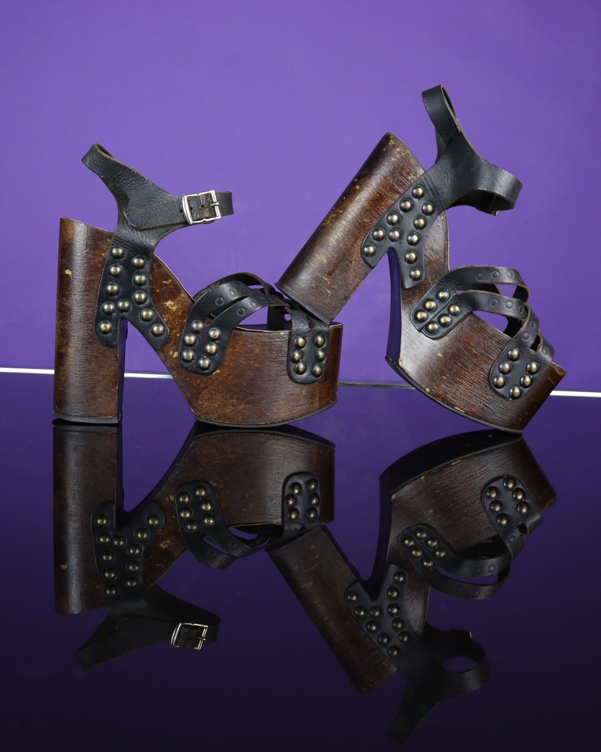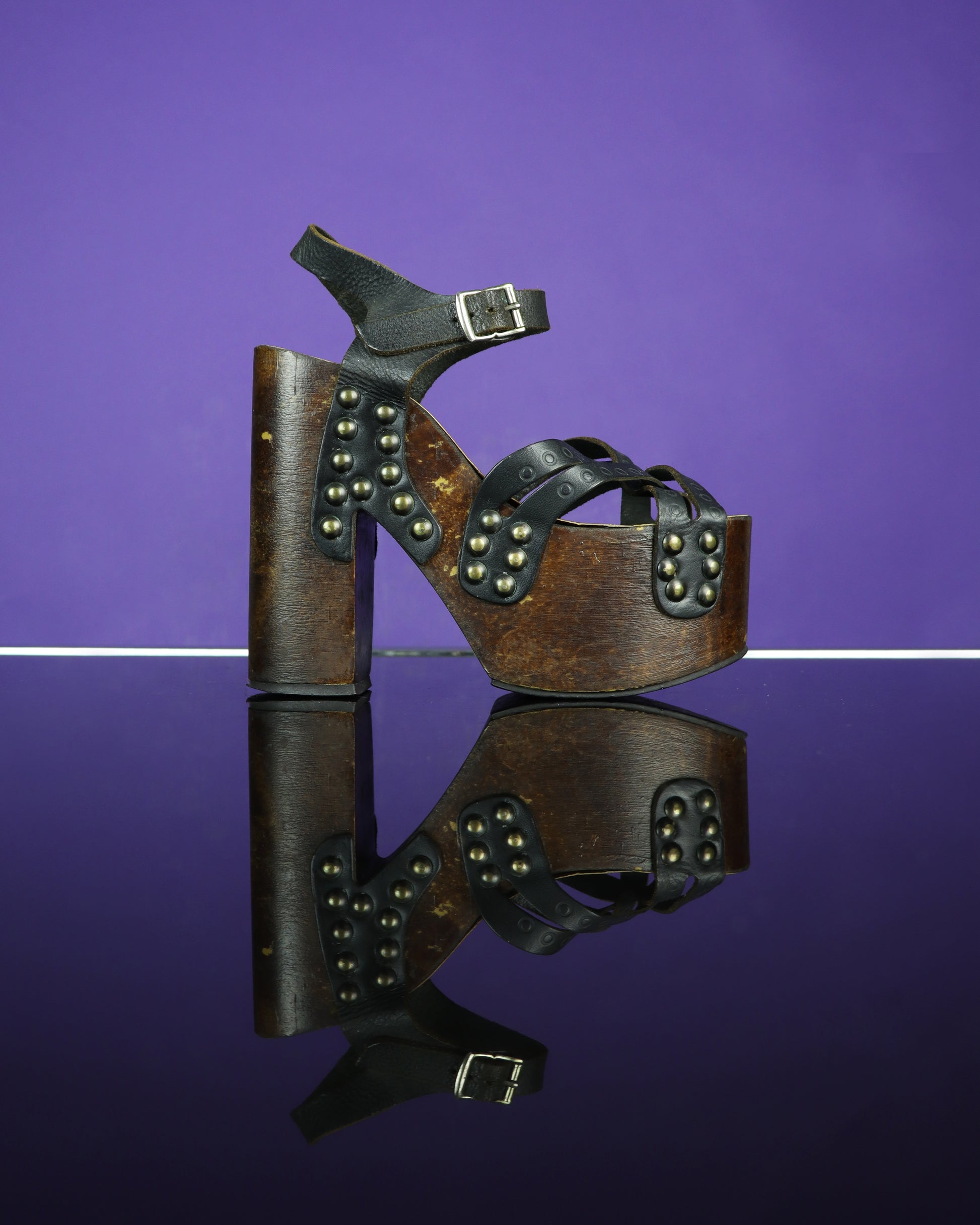 Jaw droppingly gorgeous vintage 1970s platform sandals. These are the real deal! Soft black leather with wood effect bottom(these are hollow and so totally walkable!) & metal studs- the original (and often replicated) studded design. Super rare & totally beautiful!