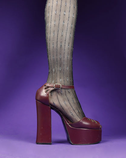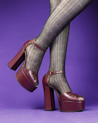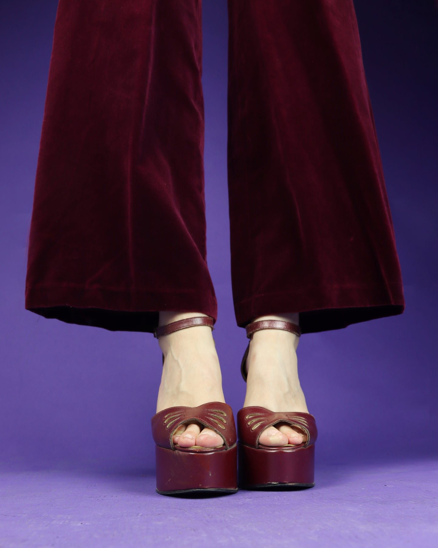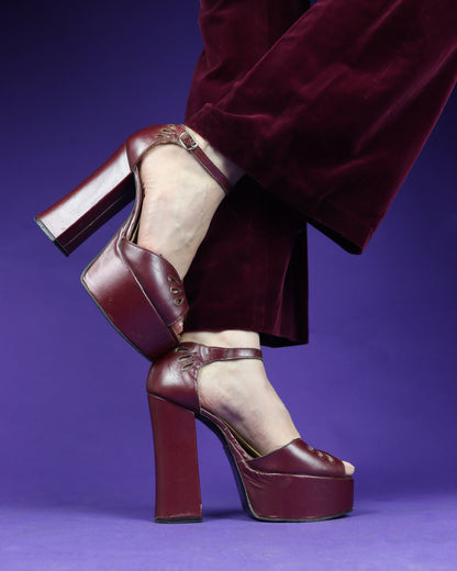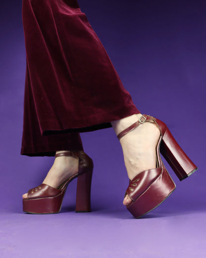 Incredible vintage 1970s glam burgundy red platform heels. Butterfly peep holes on the heel and toe strap, mega platform and block heel and elegant ankle strap with metal fastener. Made by 'Sacha'.