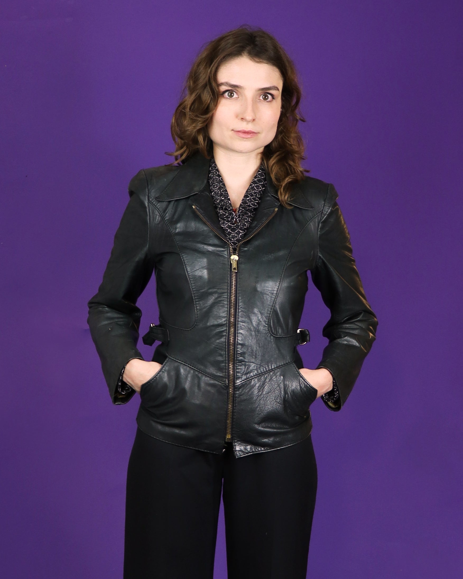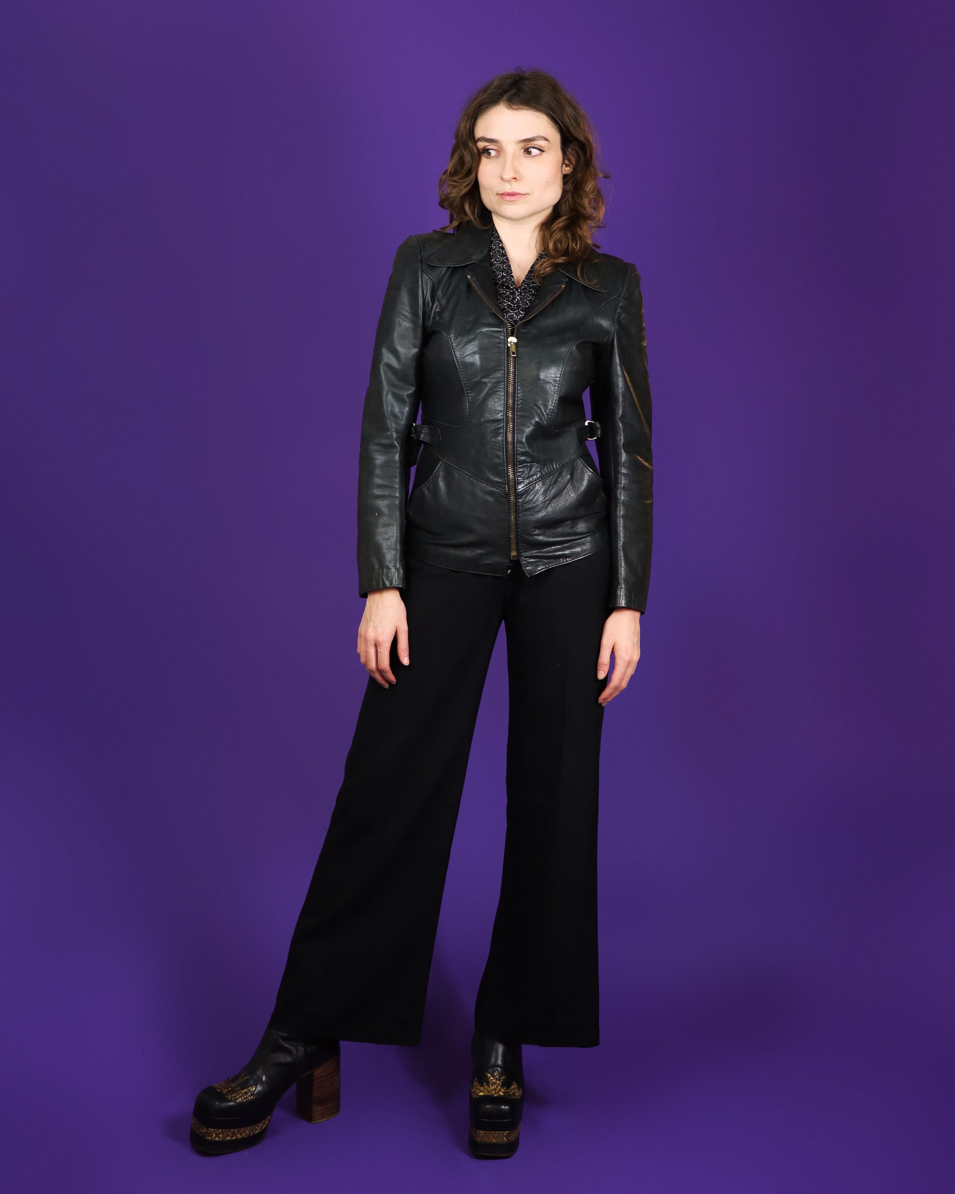 Vintage 1970s leather jacket by ultra rare and collectable Detroit maker 'Gandalf & company' designed by Richard M Buchanan. Made from a high quality leather which has afabulous sheen and patina- coloured darkest green with the appearance of black. Featuring a super 70s-does-40s shoulder heavy silhouette which is exaggerated by the waist belt detail. Beautifully made with clever pattern cutting, voluminous pleating, heavyweight brass tone metalware and signature notched collar. I love the sweet shaped pockets.