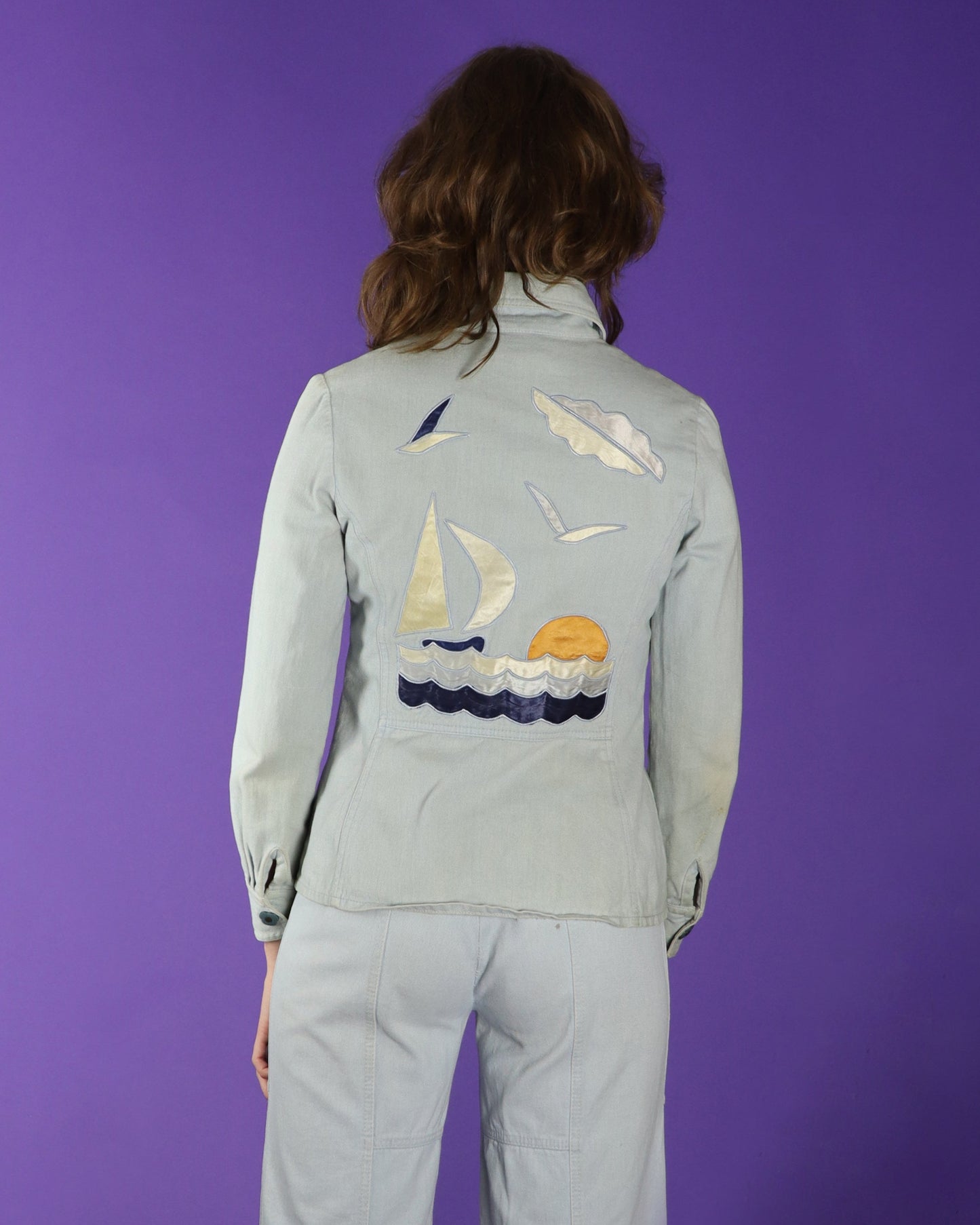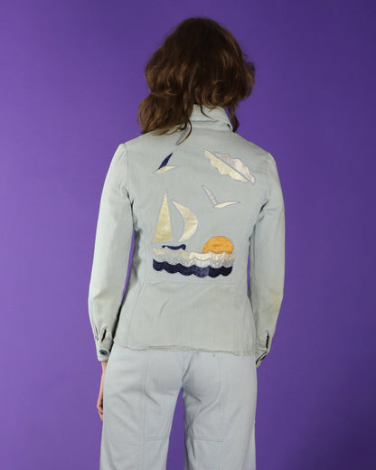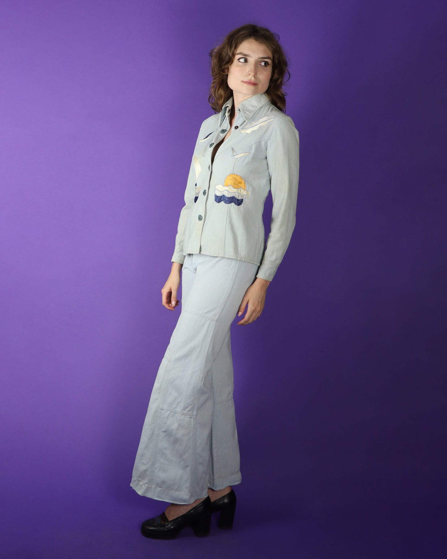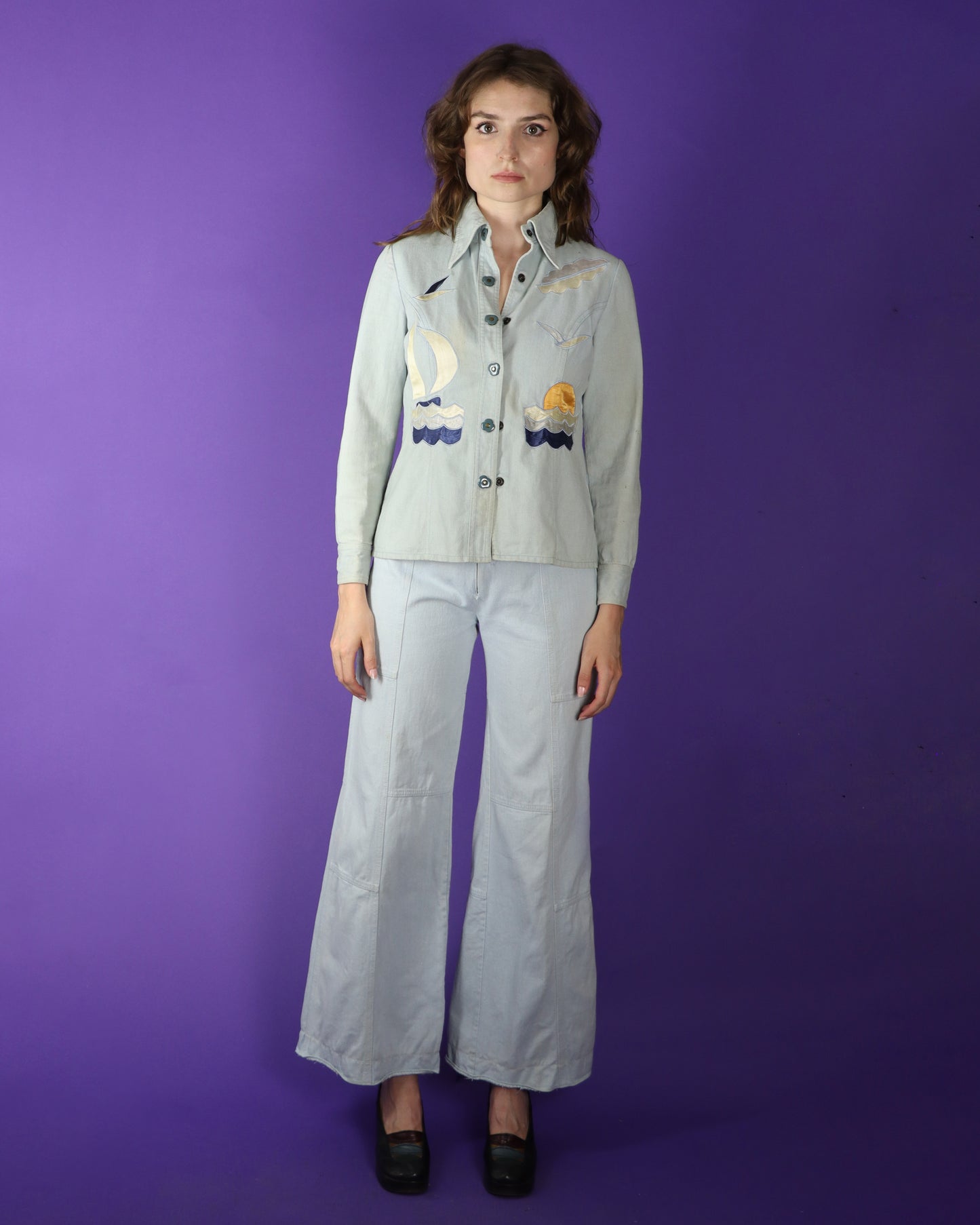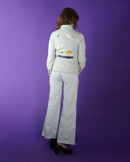 Rare vintage 1970s suit by iconic label Roncelli. Pale blue grey soft brushed denim with super sweet and whimsical nautical themed satin appliqué  on the button up shirt style jacket, and matching patchwork bell bottom flares. I love the attention to detail, duck egg coloured enamel flower poppers, the unusual colourway, the sweet seaside motifs and the fabulous dagger collar. Roncelli pieces are always so beautifully cut and are incredibly flattering. Super rare to find a matching set in this design.