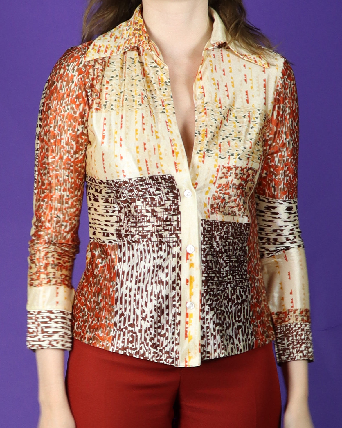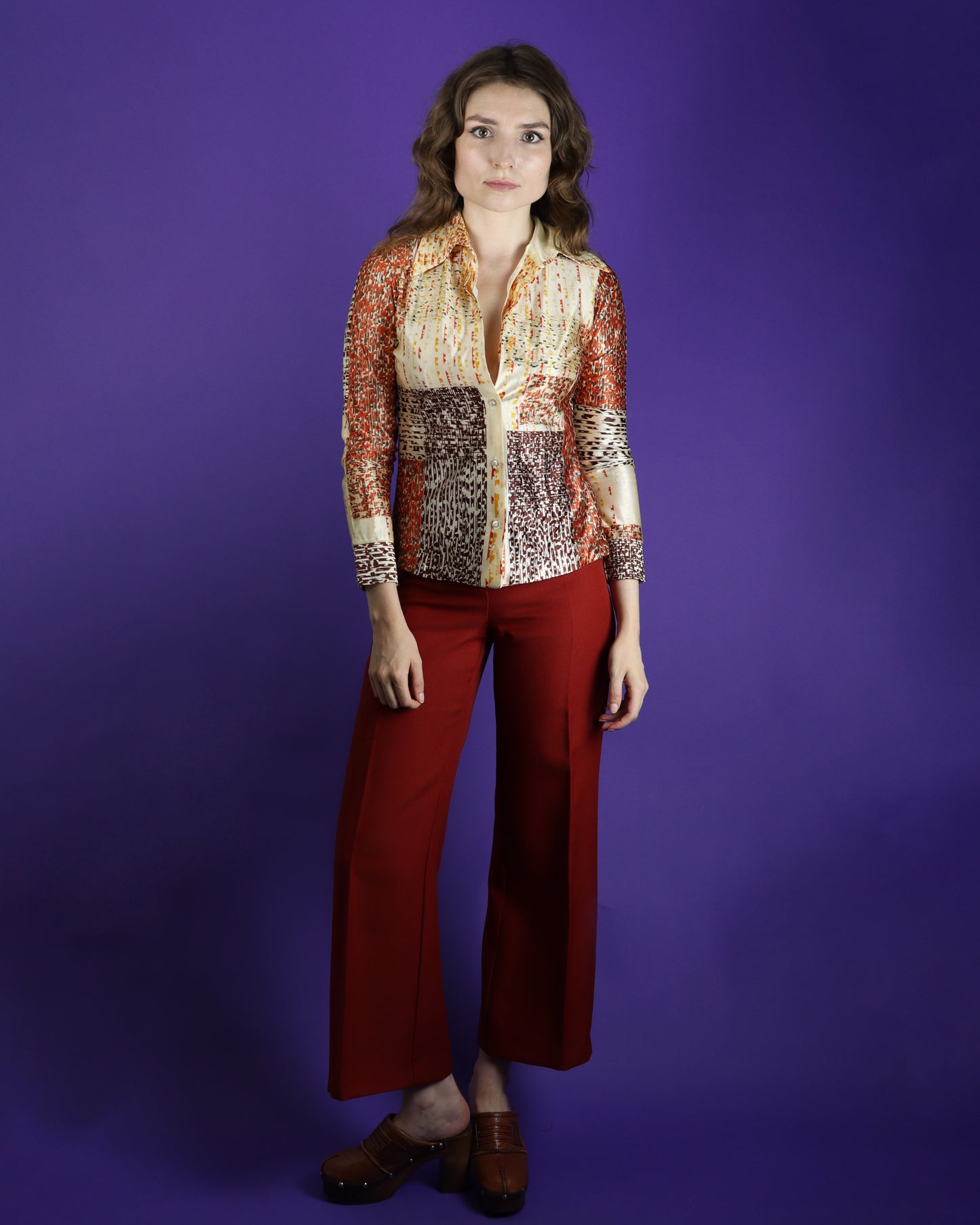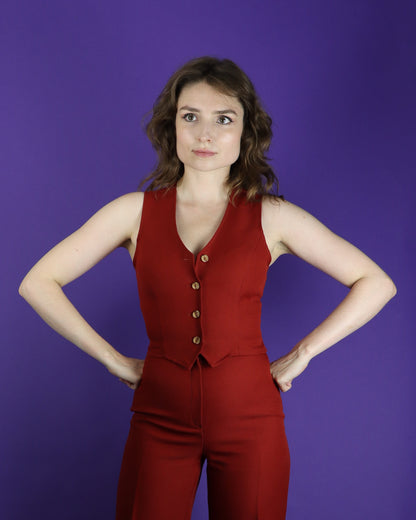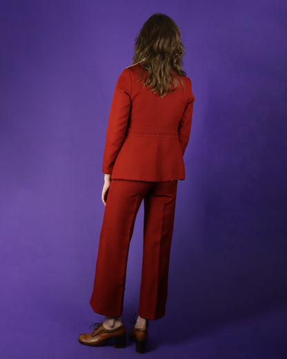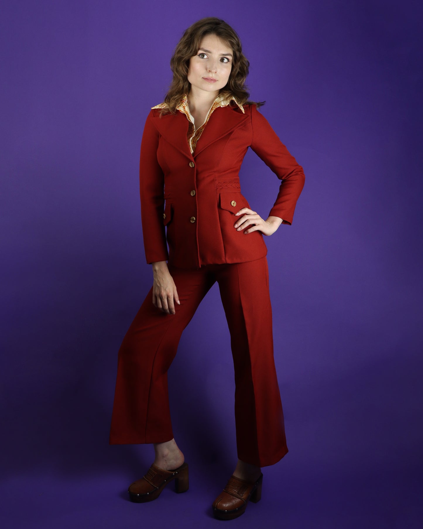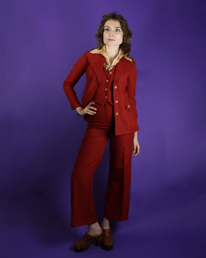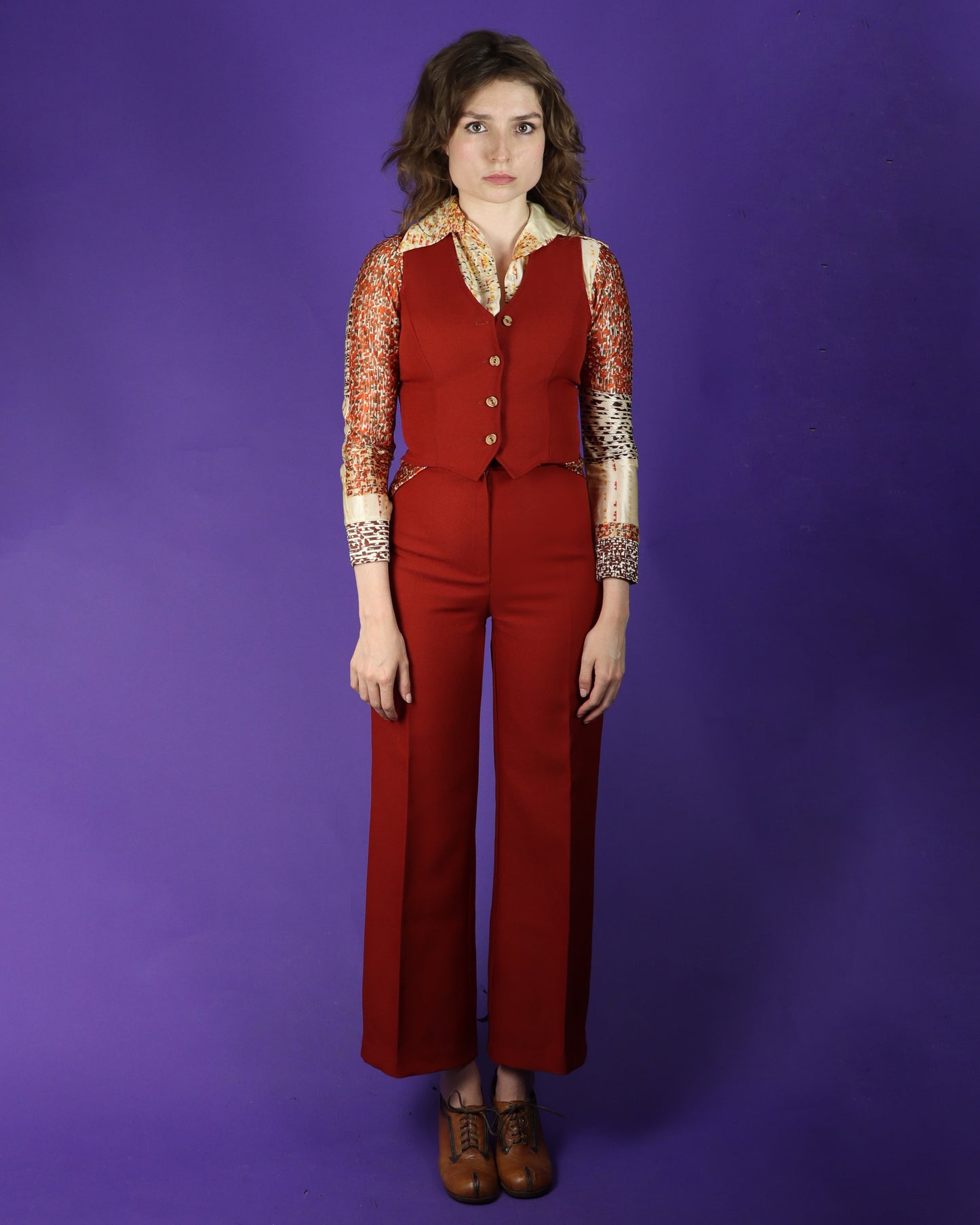 Vintage 1970s 4 piece dark red trouser suit including a slinky disco shirt. Knife edge pleat flares, button up waistcoat & a peak lapelled blazer with cute plait belt detailing. Beautifully handmade and finished with wooden buttons. A 70s trouser suit is the epitome of cool & can be split & worn in a multitude of ways- I like it with bare arms in the summertime & with the fabulous graphic dagger collar shirt in the evening. Super special and hard to find colourway.