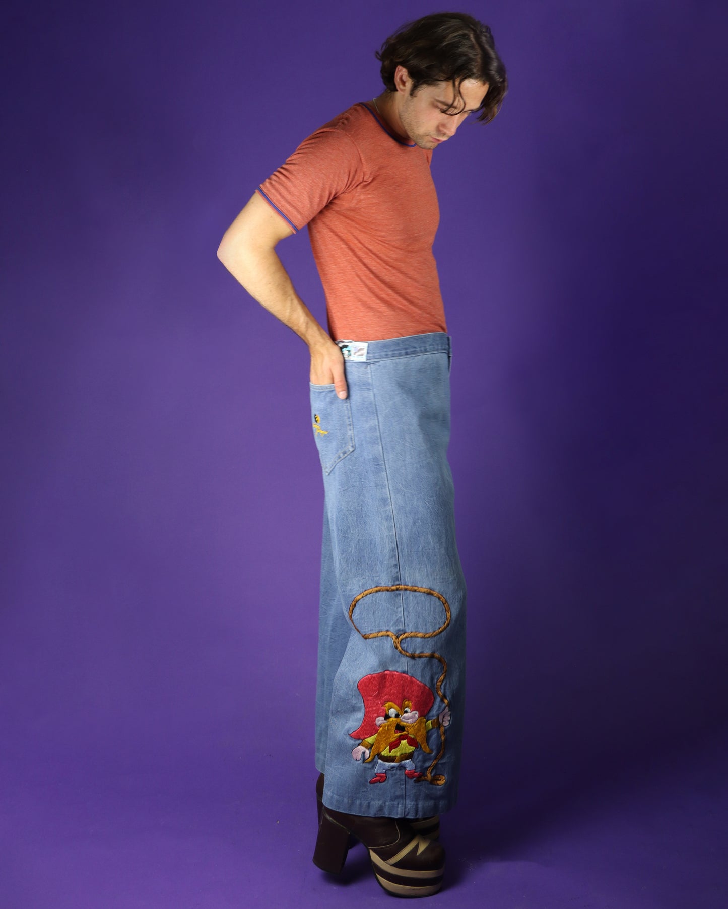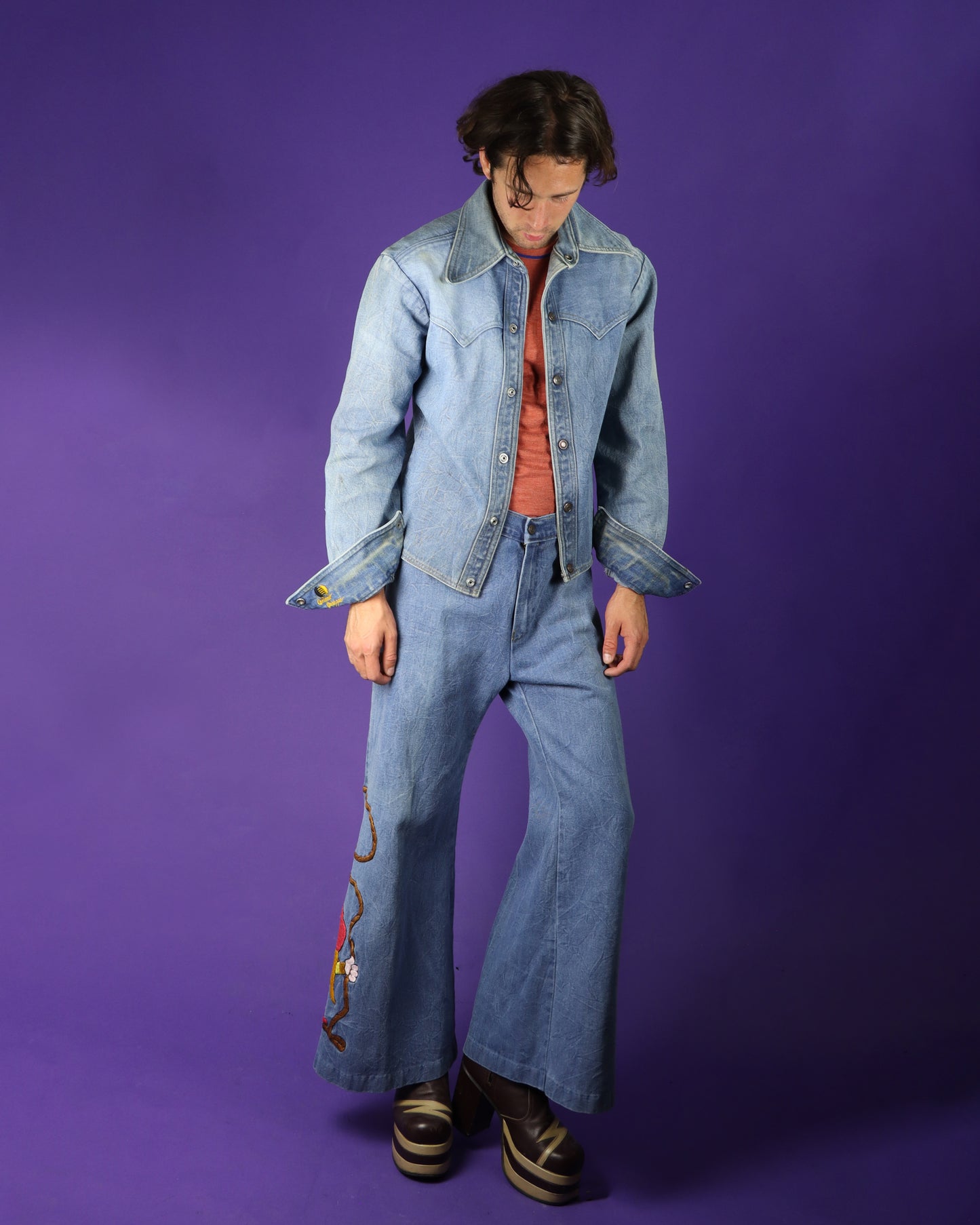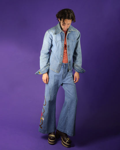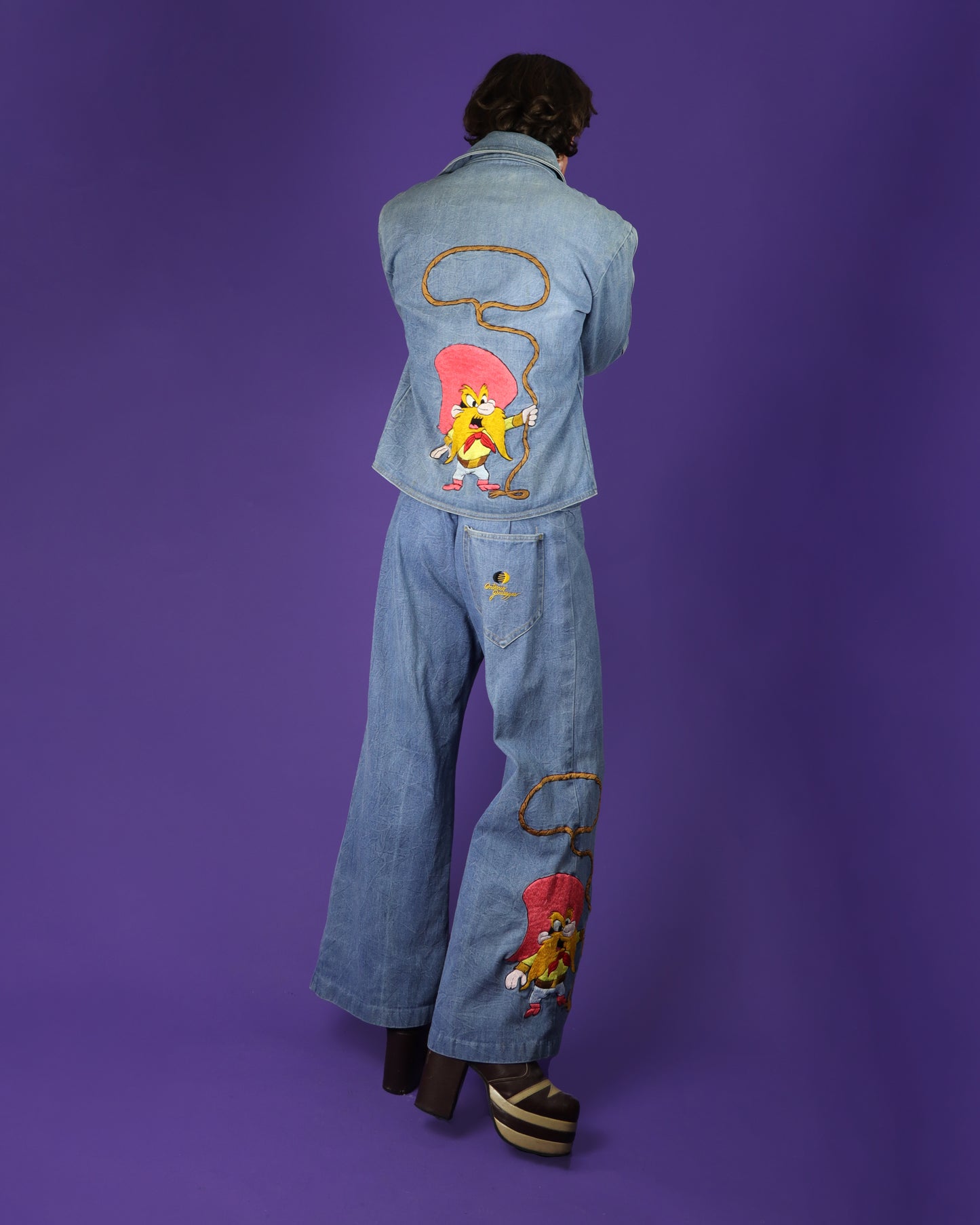 Fantastic vintage 1970s denim jacket by iconic LA based brand Antonio Guiseppe, designer Philip Havice (@ravencawl). Part of an official collaboration with Warner Bros featuring a beautiful embroidery of iconic Looney TunesYosemite Sam with lasso on the back and trouser leg. High quality lightwash denim cut with a dagger collar, popper fastenings and double over cuffs. The flares are high waisted with branding on the back pocket. Super cool & rare piece of fashion history!
